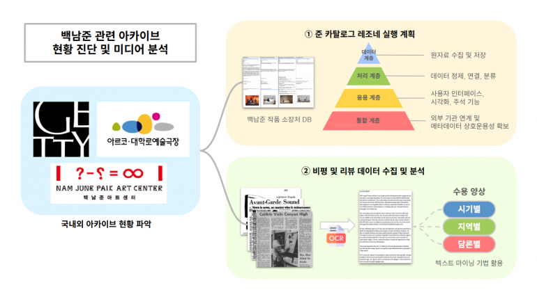 1. 국내외 기관에서 소장 중인 백남준 관련 기사, 인터뷰, 방송, 포스터, 서신 등의 자료를 OCR 처리 및 메타데이터로 정규화