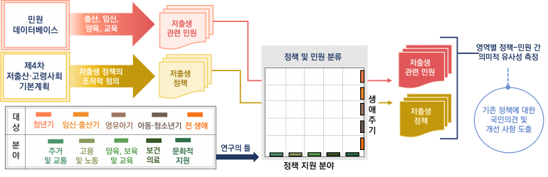 • 연구 목적: 저출생 정책의 현황과 민원에서 드러나는 국민의 요구사항을 비교하여, 기존 정책에 대한 국민 의견을 파악하고 효과적 저출생 대응 정책을 위한 제언 도출